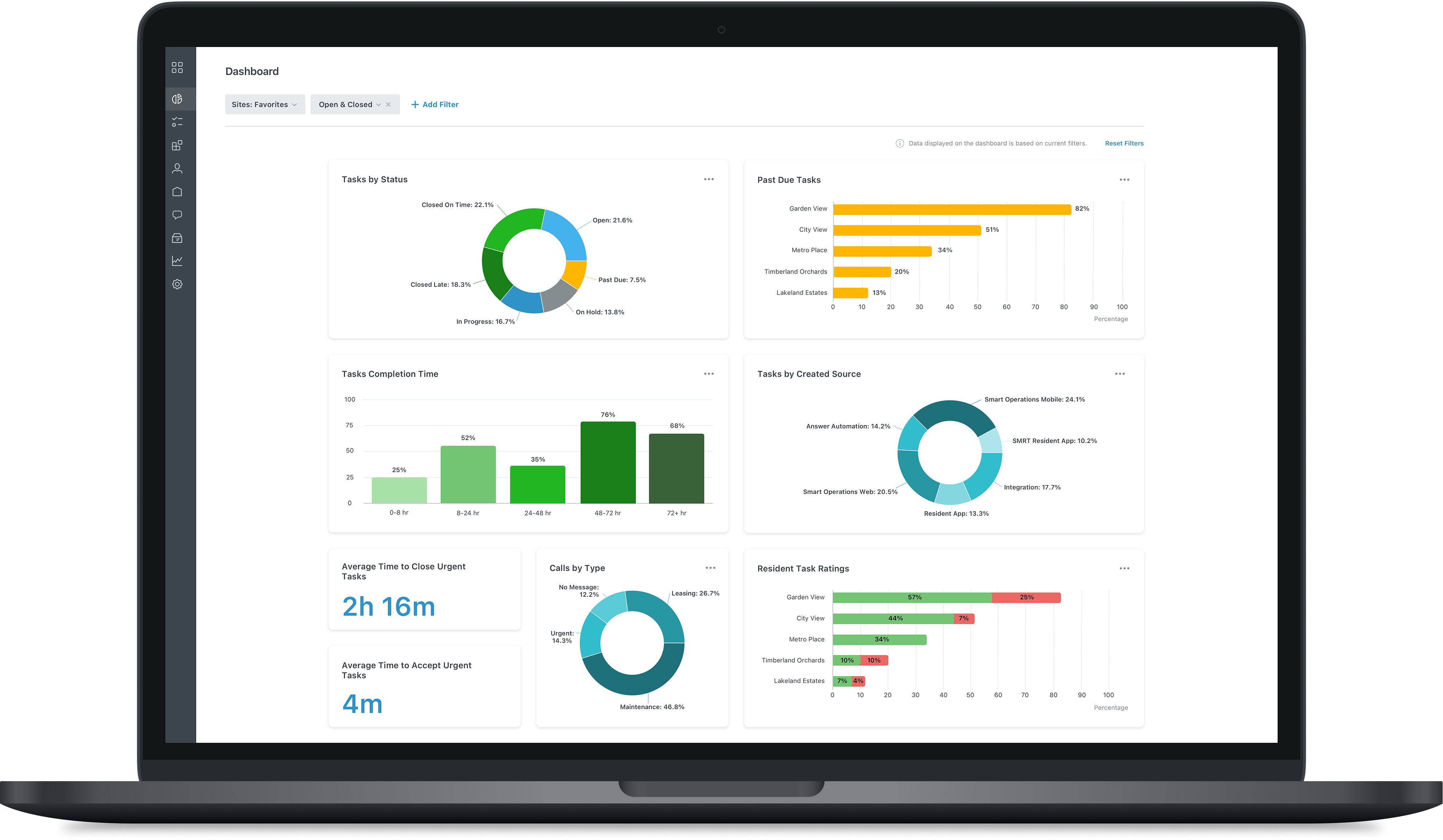 SmartRent Dashboards feature various categories, including: task status, task completion time, past due percentage, resident task ratings, call type, average time to accept urgent tasks, average time to close urgent tasks and tasks by source. Dashboards is a significant feature within SmartRent